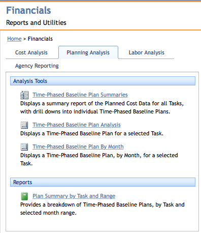The four main Financials tool groups. This particular screen shows the Planning Analysis tab.