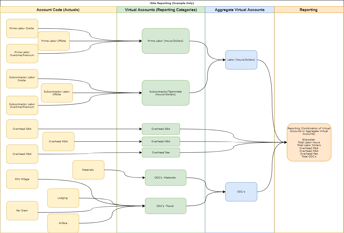 All Reporting in iSite is done via iSite Virtual Accounts, Aggregate Virtual Accounts, and ISite Query Groups (Totals). Financial Reports are Configured by your iSite Admin using report drivers to display the needed information. An example of the flow of information is below.